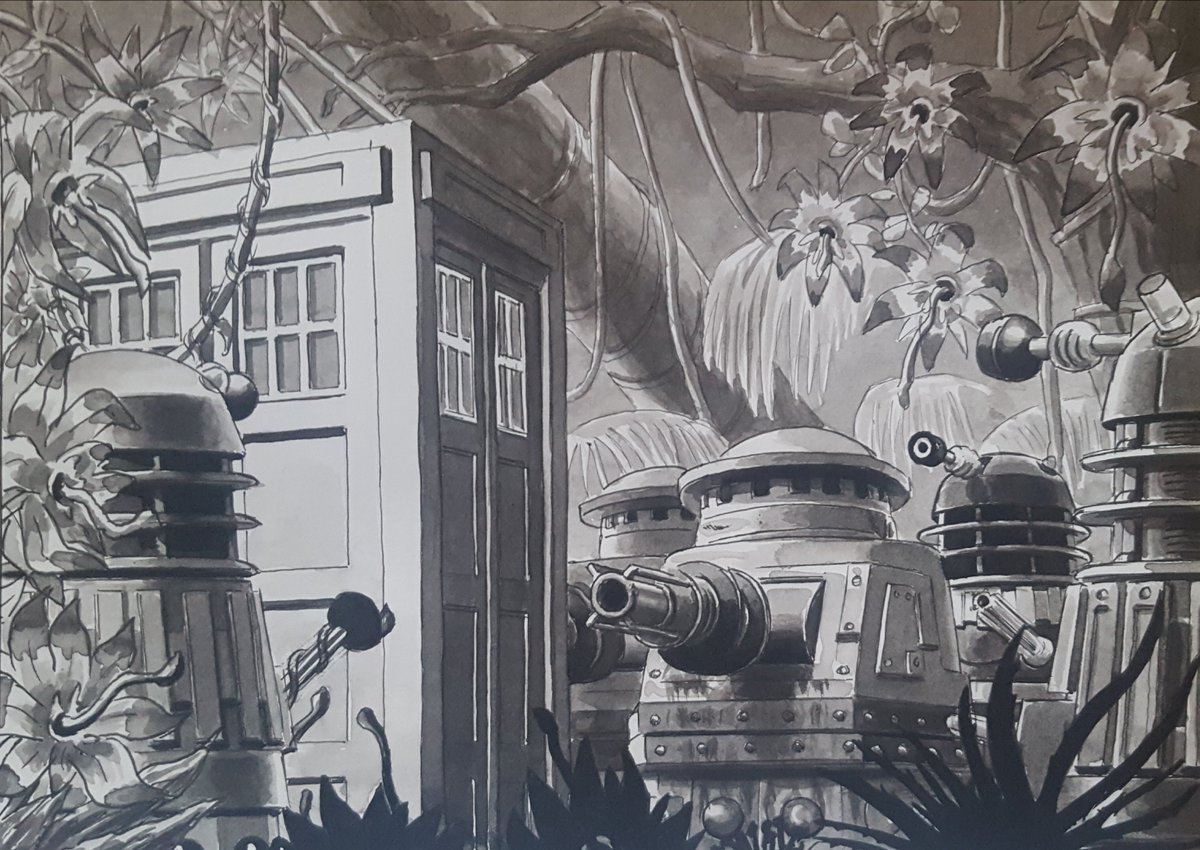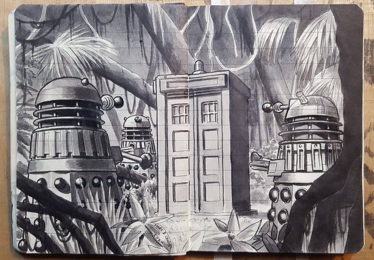 The #TARDIS has returned to Kembel. Seizing the opportunity to destroy their enemy once & for all the Daleks bring out the big guns .. but who is the predator & who is the prey? To be continued.. 😬 #DoctorWho #DrWho #Daleks #inktober2021 #Inktober #illustration #art