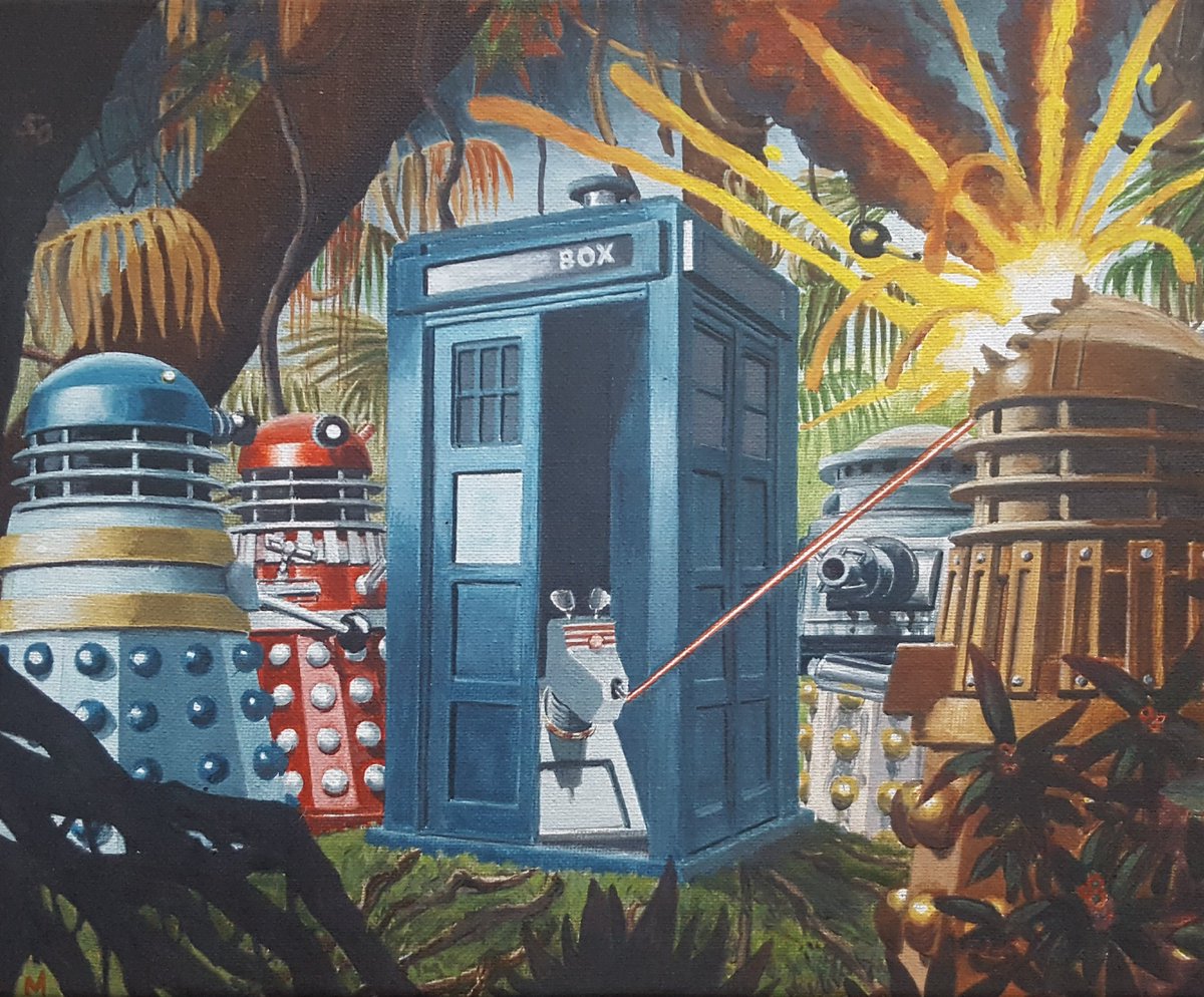 After having to sit out Destiny of the Daleks, K9 feels he has a point to prove.. 😬 (Acrylic on canvas, 25x30cm) #DoctorWho #DrWho #K9 #Daleks #TARDIS #canvas #illustration #art