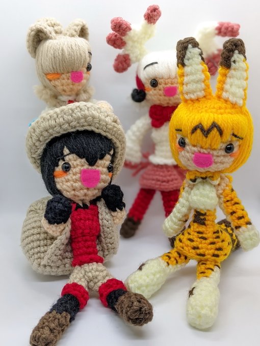 とみ屋さん( @tomisekakete )の あみぐるみ かばんちゃん サーバルちゃん 以前にお迎えしたアルパカ・スリさんとトキさんと記念撮影 #けものフレンズ #トレフェスオンライン #TFO4