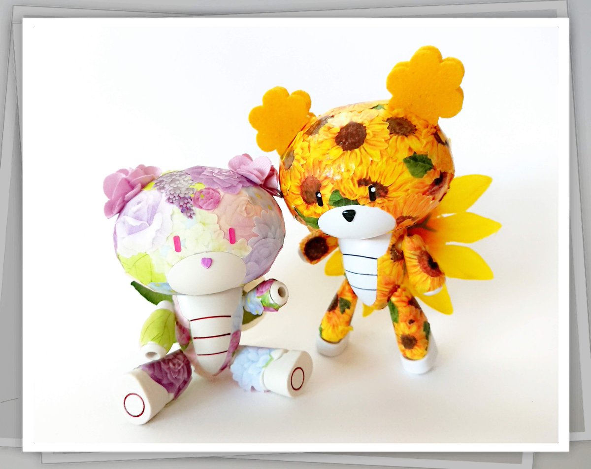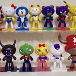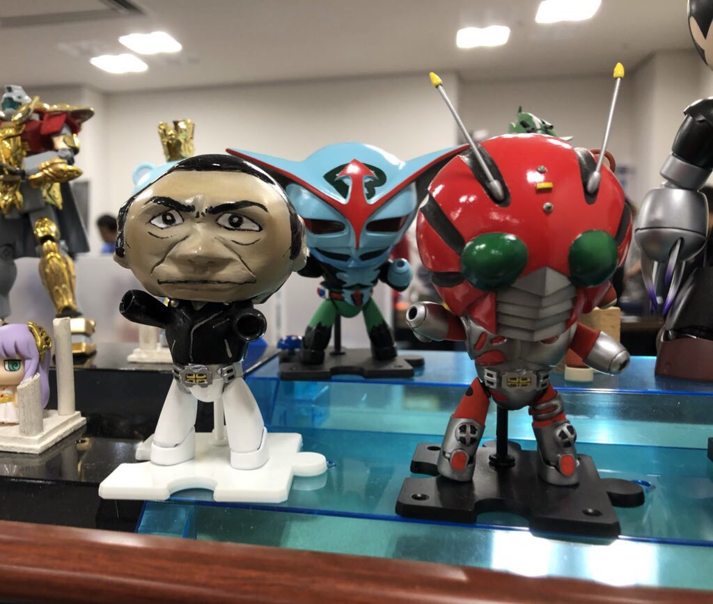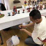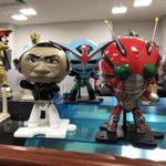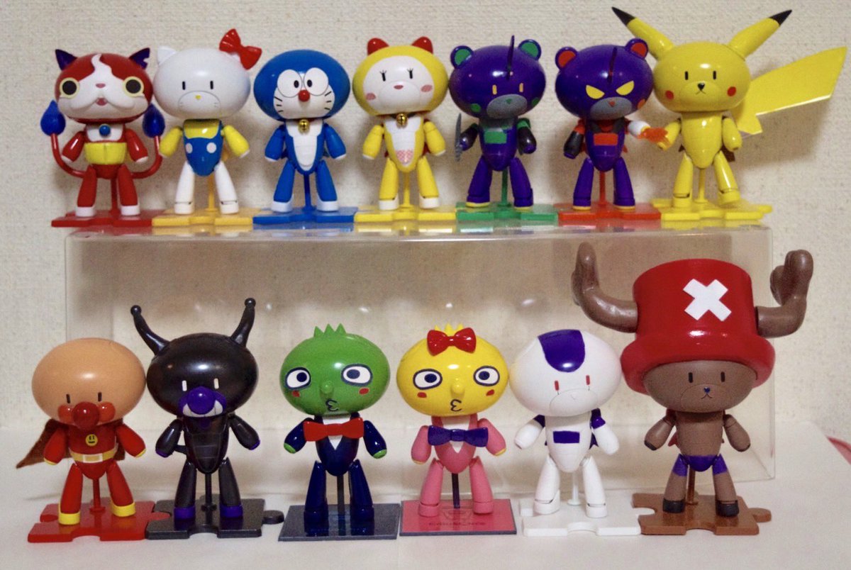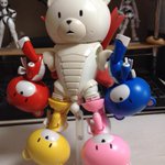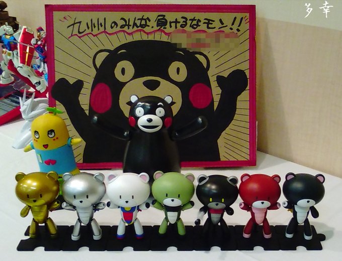 #TLに深刻なプチッガイ不足 熊本地震が起きた年の展示会で、入り口に設置したんですよ。 プチッガイは全部私が作りまして、後ろのくまモンのポップイラストも私が描きました。 くまモンとふなっしーのプラモは、別の方製作。