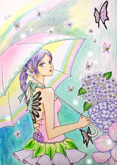 #TLを紫陽花でいっぱいにしよう 🪻 新しい傘を買って気分転換☂️•*¨*•.¸¸♬︎ 雨が花や蝶々だったら…なんて🏵🦋 素敵で快適な梅雨を過ごしましょう🌈 #イラスト #紫陽花 #アナログ絵 #illustration #anarog #rain