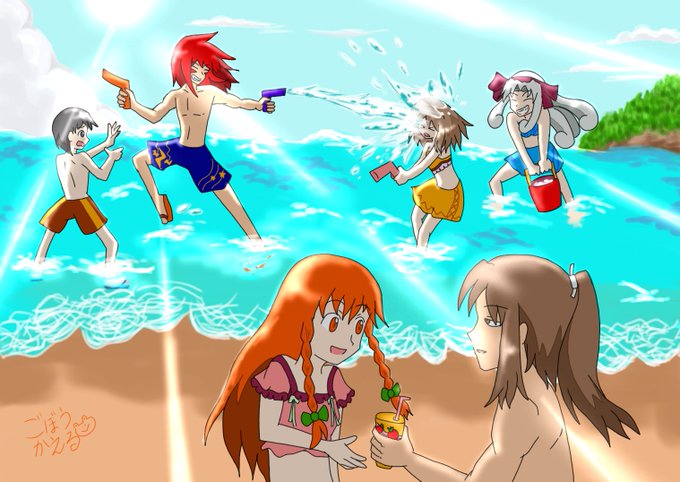「#TOKIの世界譚」 海イラストの続き。 命中率100%のプラズマがアヤの水着の上を弾き飛ばしてしまう事故発生w 皆で捜索中ww 灯台もと暗し? 気がつくがハッキリ言えない男がひとりw プラズマ「探せー! アヤが泣いちゃった!」 #イラスト twitter.com/gobou_kaeru/st…