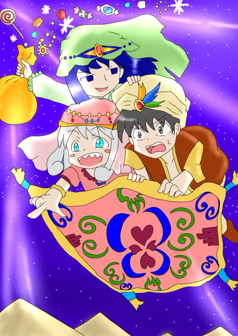 天界音楽さんの(@Pictionalkey)企画! #12ヶ月の小品集2023 7月は「アラビアンナイト」! と、いうことで 熱帯夜に空飛ぶ絨毯に乗ったお菓子どろぼう出現w 「次はあそこのお菓子だ!」 アラビアンナイトっぽくしてみました! #TOKIの世界譚 #イラスト #アイビスペイントX #ibisPaintX