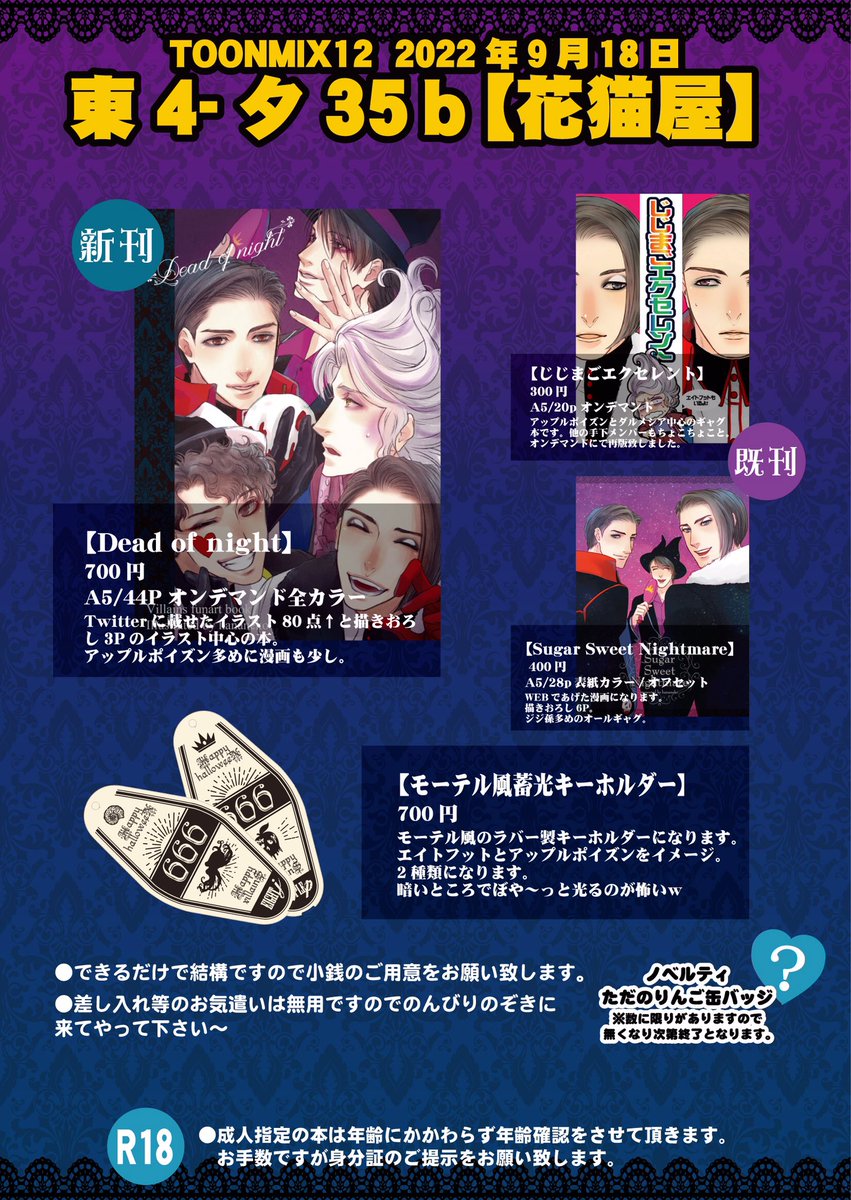 18日のTOONMIXお品書きです。 東4ホール タ35b「花猫屋」にてお待ちしております。 差し入れ等はご無用ですので!気軽に来てやって下さい😊 スケブも私で良ければ!(画材が無いので大したものは描けないですけど💦) #TOONMIX12 #TOONMIX