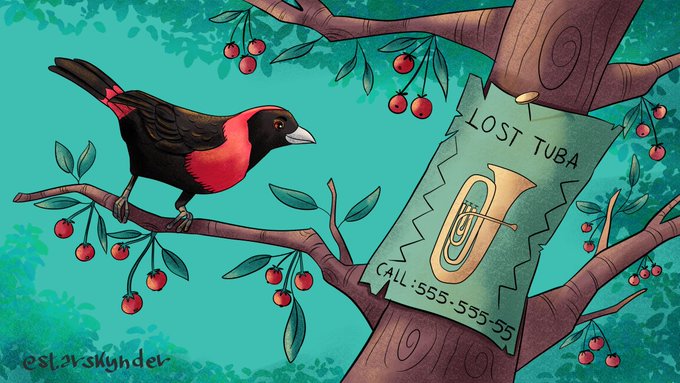 Tuba Tanager @AnimalAlphabets #AnimalAlphabets #digitalart #tuba #comics #illustration #art #clipstudiopaint #animals #tanger #birb