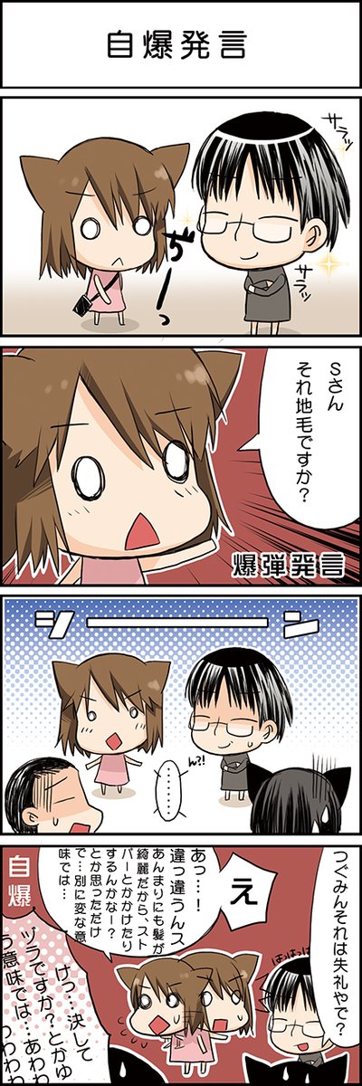 あまりにも綺麗でツヤツヤで真っ黒な髪の毛だから本当に同じ人間の髪の毛なの?という気持ちで聞いた。 #TUGUMIXcomic 095_自爆発言 #日常漫画 #4コマ漫画 #コミックエッセイ #漫画が読めるハッシュタグ #エッセイ漫画
