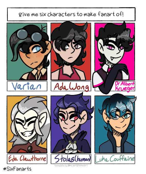 Credit to @Maskara_arts , @ElivaraFloof , @gay4albedo and a few friends from discord for suggestions!! #SixFanarts #SixFanartsChallenge #Tangled #ResidentEvil #adawong #TWDAK #EdaClawthorne #tohfanart #helluvabossstolas #HelluvaBoss #MiraculousLadybug