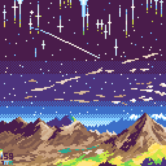 Shining Star Ridge Belt Massive mountain ridge that known for it's beautiful view when night and less cloud occur. You can see many stars shining like aurora. #pixelart #illustration #T_MR2 #ArtistOnTwitter #イラスト #ドット絵 #scenery