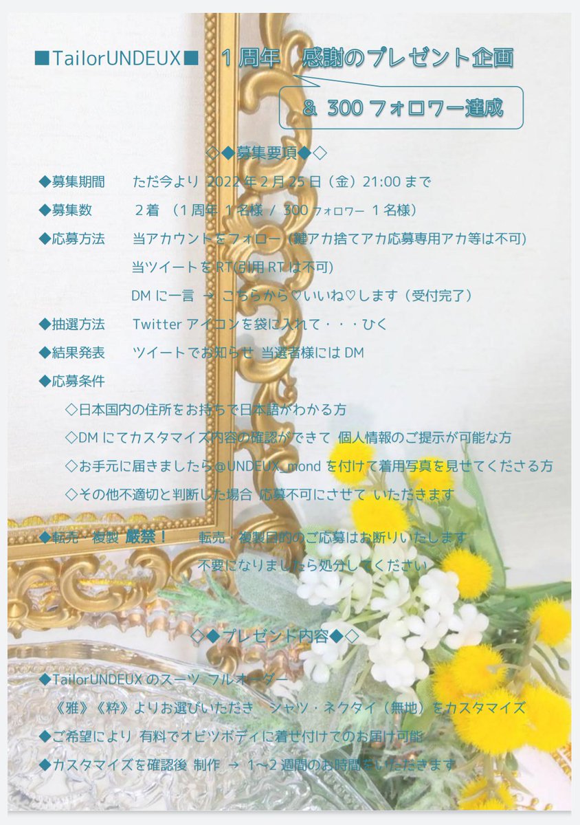 ㊗️■TailorUNDEUX■1周年㊗️ 💗300フォロワー達成💗 たくさんの方にご覧いただき たくさんの方に作品を手にとっていただけた… とても幸せな1年でした💗 感謝の気持ちを込めて🎁プレゼント🎁 詳細は3枚目 ↓ 続きます #オビツろいど #オビツ11服 #TailorUNDEUX undeux.booth.pm