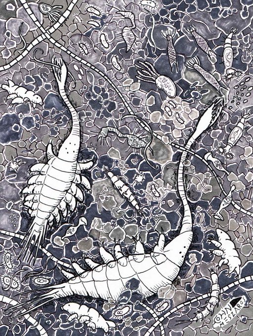 A pair of speculative meiofaunal #opabinia, close relatives of #radiodonts. They use their long trunks to feed on #tardigrades #rotifers #ciliates khinorhynchs, gastrotrichs, and other microbes #speculativebiology #paleoart