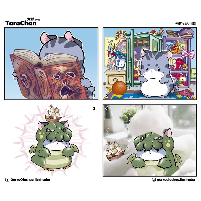 TaroChan, el gatito cosplayer, lee un libro muy antiguo y le dan ganas de buscar su traje de Cthulhu. Por favor RT. #TaroChan con más disfraces en: bit.ly/31AHYM8 Sígueme en IG: bit.ly/2WnTjMf #webcomic #cosplayer #gatito #cthulhu #HPLovecraft #necronomicon