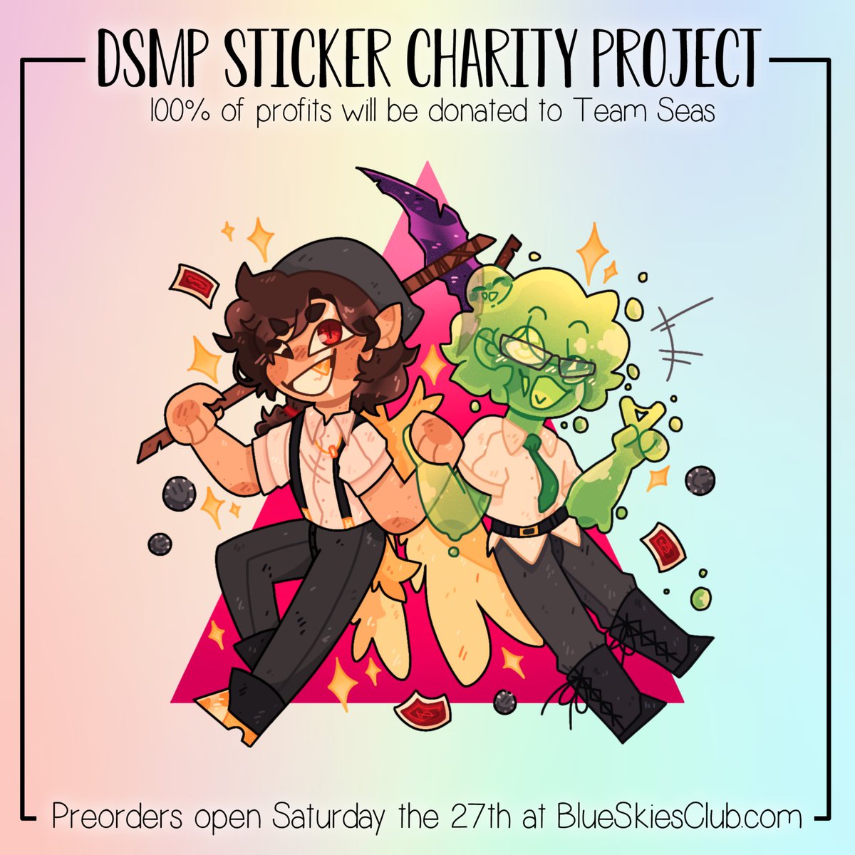 HEY!! Come get a couple funky Dream SMP stickers made by some really snazzy artists!! And as a bonus, you can help clean up the ocean so it's win win! Make sure to check it out!! #dreamsmp #dreamsmpfanart #dsmp #quackity #quackityfanart #slimecicle #slimeciclefanart #teamseas