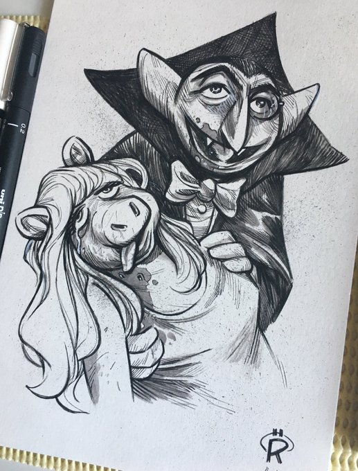 My day 4. Miss Piggy & Count von Count aka Conde Draco & Peggy #spookytober A5/ Canson mixed media. Pen, ink and inkwash. A V A I L A B L E #inktober2021 #inktober #Muppets #teleñecos