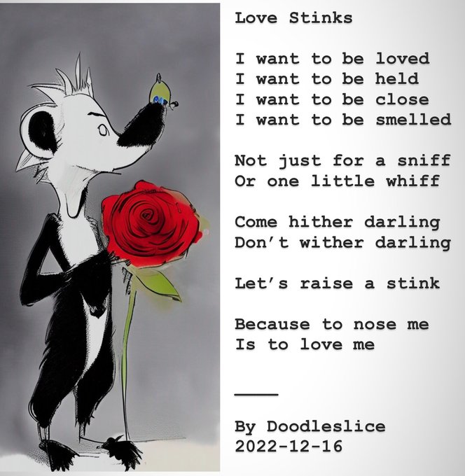 Love Stinks objkt.com/asset/KT1U26M8… #nft #nftart #skunk #poem #tez #tezos #tezosart #love #lovestinks @objktcom #nftpoem @niftorian #nftmintmonday