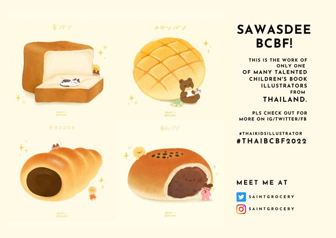 Hi! I'm an illustrator who loves to draw food and cute things, and I also love to do clay charms💗✨ nice to meet you! ig : saintgrocery #ThaiKidsIllustrator #ThaiBCBF2022