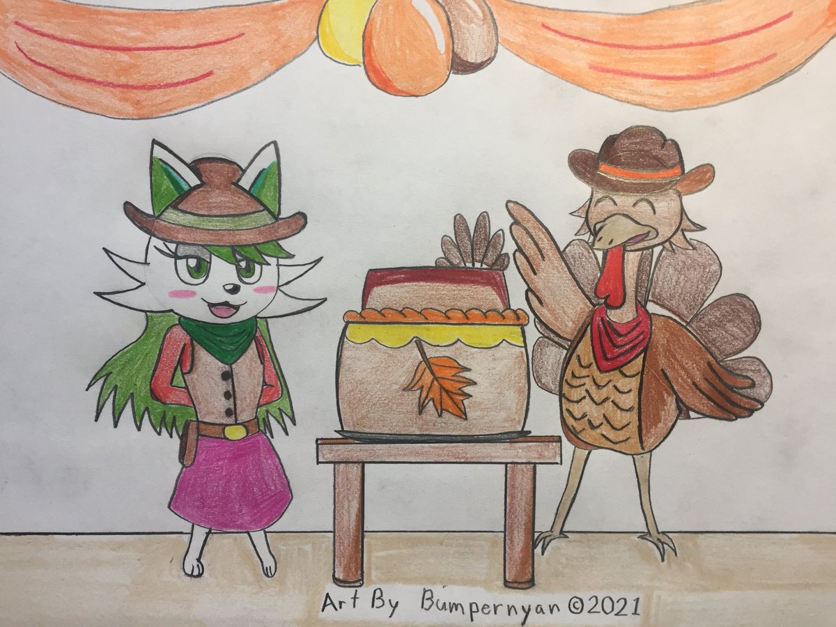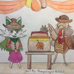 Haha! Look at that, Mr. Derby and Melody both baked a delicious Thanksgiving Cake to our dinner table! What you think. #BumperMonster #illustration #Illustrator #cuteart #OC #Thanksgiving #Thanksgiving2021 #MonsterOC #Cake #イラスト #バンパーブロック