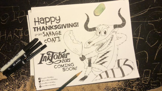 Happy #Thanksgiving from my ravenous friend, Savage Coati! My #Inktober2021 project is still a work in progress, Stay TOONed! #HappyThanksgiving #Thanksgiving2021 #HappyThanksgiving2021 #coati #coatimundi