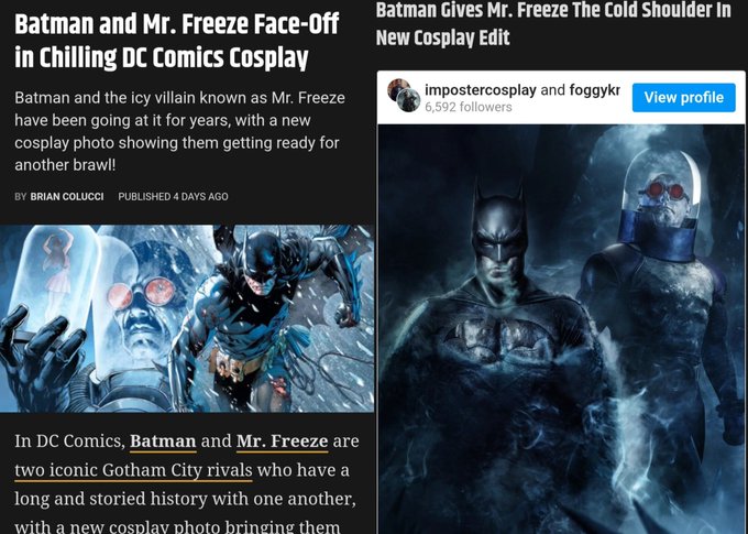 Thank you @screenrant for the feature of me and my friend @FoggyKnight14 ! We are honored and will definitely have more to come. #screenrant #TheBatman2 #Batmancosplay #Cosplay #MrFreeze