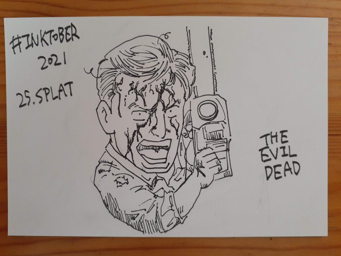インクトーバー25日目:お題「SPLAT」 作品「the EVIL DEAD」 ホラーとコメディの傑作ですね。はちゃめちゃ過ぎて笑うしかない。三作目は「キャプテンスーパーマケット」ってやりたい放題ですね。 #inktober2021day25 #inktober #インクトーバー2021 #fountainpen #theevildead