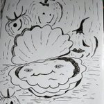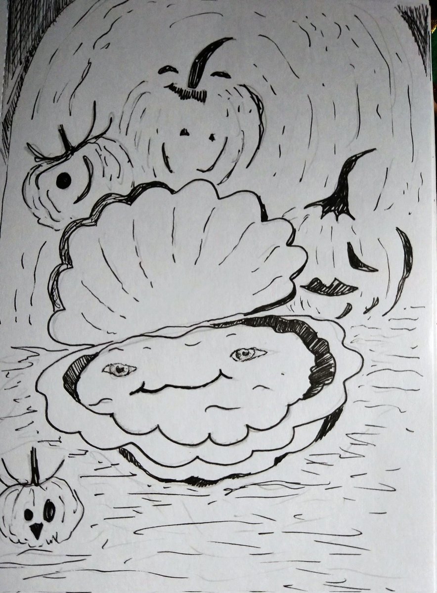 Todays #sketch is Day 4 @inktober #inktober2022 #Inktober wandering around in the dark, #TheNaughtyPumpkins are greeted by a #scallop her light and magical voice warn them of approaching danger 🎃🎃#Ink #pumpkins #Halloween2022