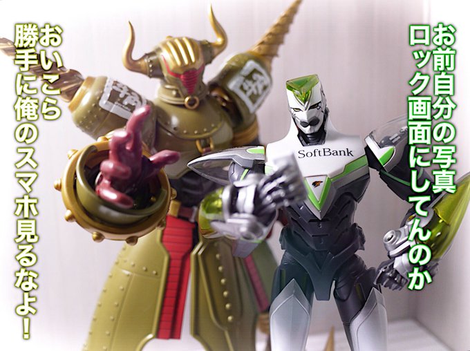 #夜のフィギュア撮影会 6/9 お題 『ロック』過去作 ギターを抱えてロックを演奏するロックバイソンの写真をスマホのロック画面にしているロックバイソン。 #tigerandbunny #タイバニ #SHFiguarts