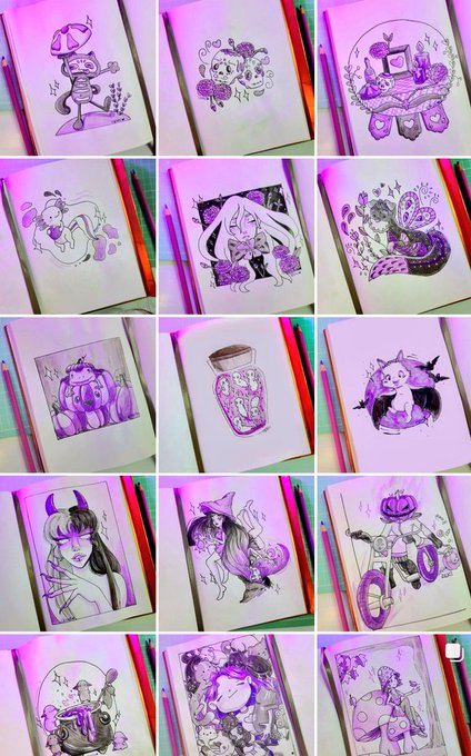 Ya 15 días del #Inktober ?? Que rápido, miren como esta mi feed de instagram 🥰😍 Vayan a darle mucho amor a los dibujitos!💜 Por el momento mi día favorito fue el 2 💕 #Inktober2022 #betsytober22 #arte #Artists #dibujos #tradicional #acuarela