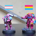 Slightly blurry picture of my current Space Marine #LGBTQ themed Kill Team. From left to right : #nonbinarypride #transpride #pansexualpride #lesbianpride
