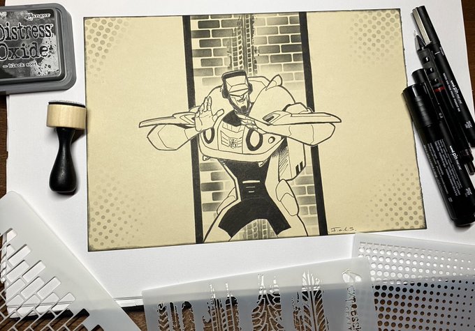 An old Jazz doodle I printed off to test a lightbox on. Finished him with all inks. #Inktober #TransformersAnimated