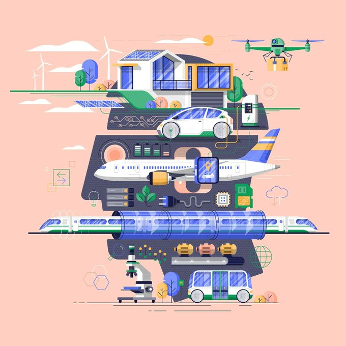 Editorial illustration by #AdrianBauer for #Electrified magazine about the importance of sustainable transportation. #Explore more: buff.ly/3veMyyw #editorial #illustration #editorialillustrator #sustainable #transportation #electrictransportation #digitalart