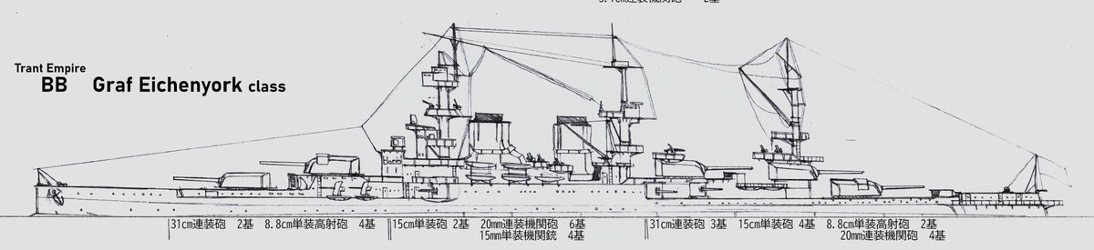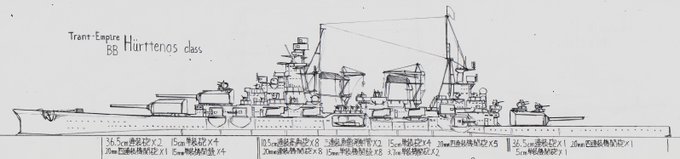 #架空艦 #イラスト #Trant_Empire 名称 Hürttenos(フルテノス)級 戦艦 主砲 36.5cm連装砲 3基 副砲 15cm単装砲 8基 対空 10.5cm連装高角砲 8基 機砲 5cm単装機関砲 1基 機砲 3.7cm単装機関砲 2基 機砲 20mm四連装機関砲 6基 機砲 20mm連装機関砲 8基 機銃 15mm単装機関銃 12基