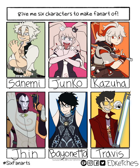 Six Fanarts completo!!!! Tarde un poco más de lo esperado pero me gustó mucho como quedó. #sixfanarts #illustration #sanemishinazugawa #junkoenoshima #kaedeharakazuha #jhinlol #Bayonetta #travistouchdown