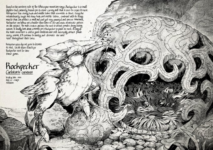 Trial of Ink - Day 11 - Craft Rockpecker Caelaturis curiosus I rarely make a birb creature, so here it is a smoll birb with artistic talent~ #trialofink #trialofink2021 #inktober #artober #drawtober