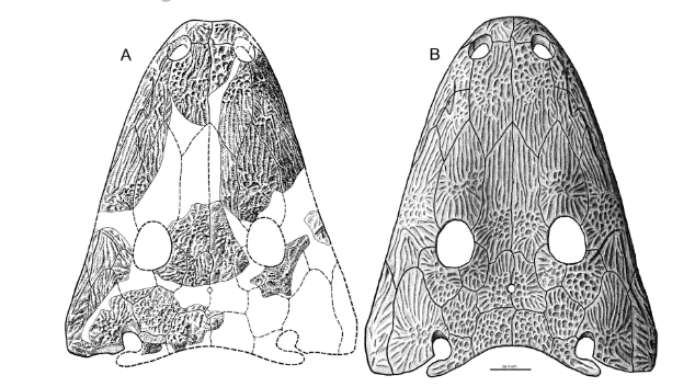 Skull reconstructions of both species of Microposaurus, Microposaurus casei from the Karoo Basin an Microposaurus averyi from Australia #paleoart #sciart #amphibian #microposaurus #temnospondyl #trematosaur #temnospondyltuesday #skull #triassic