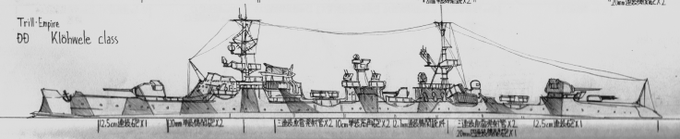 #架空艦 #イラスト #Trill_Empire 名称 Klöhwele(リョール)級 装甲水雷砲艦(駆逐艦) 主砲 12.5cm連装砲 2基 対空 10cm単装高角砲 2基 機砲 20mm四連装機関砲 1基 機砲 20mm単装機関砲 2基 機銃 12.7mm連装機関銃 4基 水雷 三連装魚雷発射管 4基