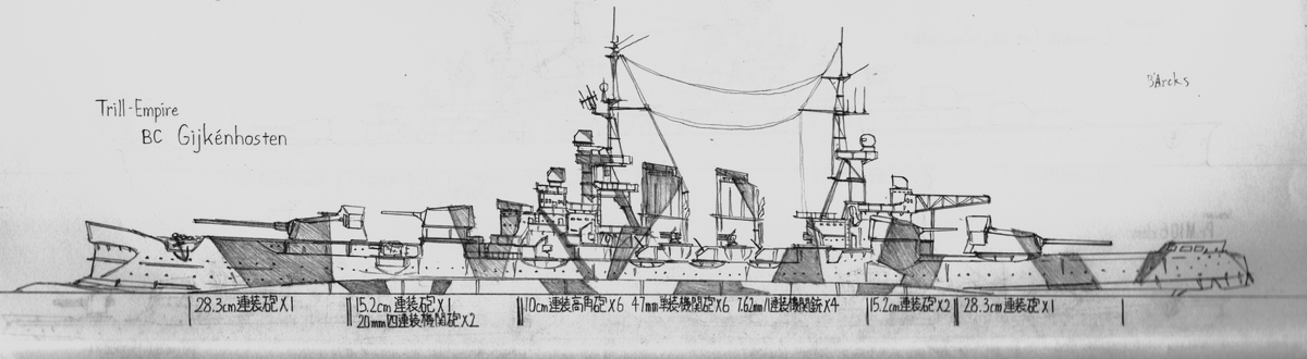 #架空艦 #イラスト #Trill_Empire 名称 Gijkénhosten(イーケンハステン) 独立戦闘装甲砲援艦 主砲 28.3cm連装砲 2基 副砲 15.2cm連装砲 3基 対空 10cm連装高角砲 6基 機砲 47mm単装機関砲 6基 機砲 20mm四連装機関砲 2基 機銃 7.62mm八連装機関銃 4基 twitter.com/YunuKanagawa/s…