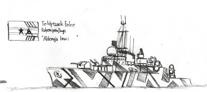 #架空艦 #イラスト #Trutzgrad_AR 名称 Aldemaja Pavlovka(アルデマヤ イマリ) ミサイルコルベット 主砲 76mm単装速射砲 1基 機砲 30mm多砲身機関砲 1基 誘導 ミサイル連装発射器 1基 対艦 対艦ミサイル連装発射器 4基 対潜 80UA 212mm多連装対潜ロケットシステム 2基