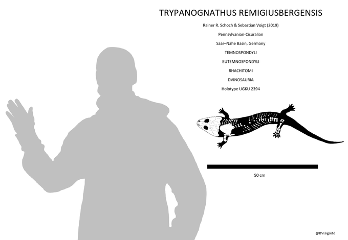 Trypanognathus remigiusbergensis is a small-ish dvinosaurid #temnospondyl from the late Carboniferous and the early Permian of Germany (second scale bar is 5cm) #paleoart #SciArt #skeletal #amphibian #dvinosaur #permian #carboniferous #temnospodyltuesday #Trypanognathus