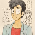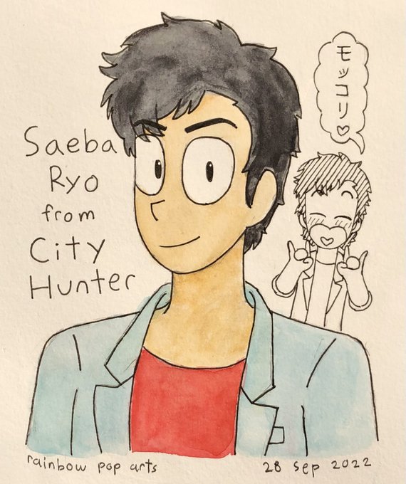 Saeba Ryo from a series called City Hunter! 😆 What his mini version said is “mokkori”, something he always say in the anime. But in the manga, “mokkori” is the sound effect for his…😐 #シティーハンター #tsukasahojo #ryosaeba #cityhunter #anime #manga #drawing #art #watercolor