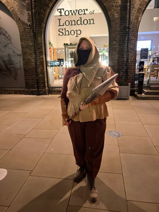 Both @mrssoup and I ran into @Sarah_RScott who showed up to the White Tower of London tonight in this fun, last-minute Aiel costume. … Now that I think about it, it didn’t go so well the last time Aiel came to the Tower. 😬 #cosplay #TheWheelOfTime #twitteroftime twitter.com/Sarah_RScott…