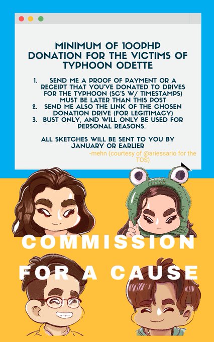 COMMISSIONS FOR A CAUSE Henlo goodmorning, I’ll be doing bust commissions for 10-15 slots. Minimum of 100 pesos donation for the victims of the typhoon Odette will get a bust sketch from me. RTs are vv much appreciated #commissionforacause #TyphoonOdette #artph