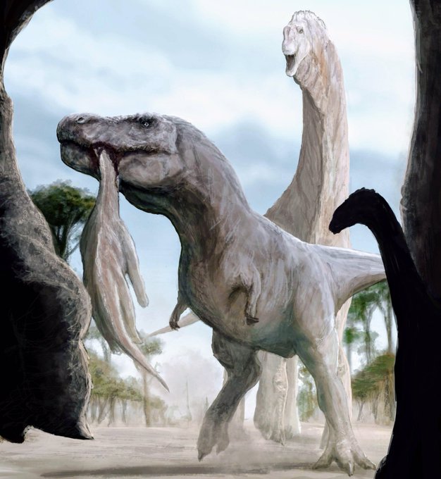 As fearsome as the big theropods were, odds are they targeted juvenile far more than the adults. Art posted on Reddit by schmevan117. #TyrannosaurTuesday #dinosaurs #TyrannosaurusRex #paleontology #paleoart
