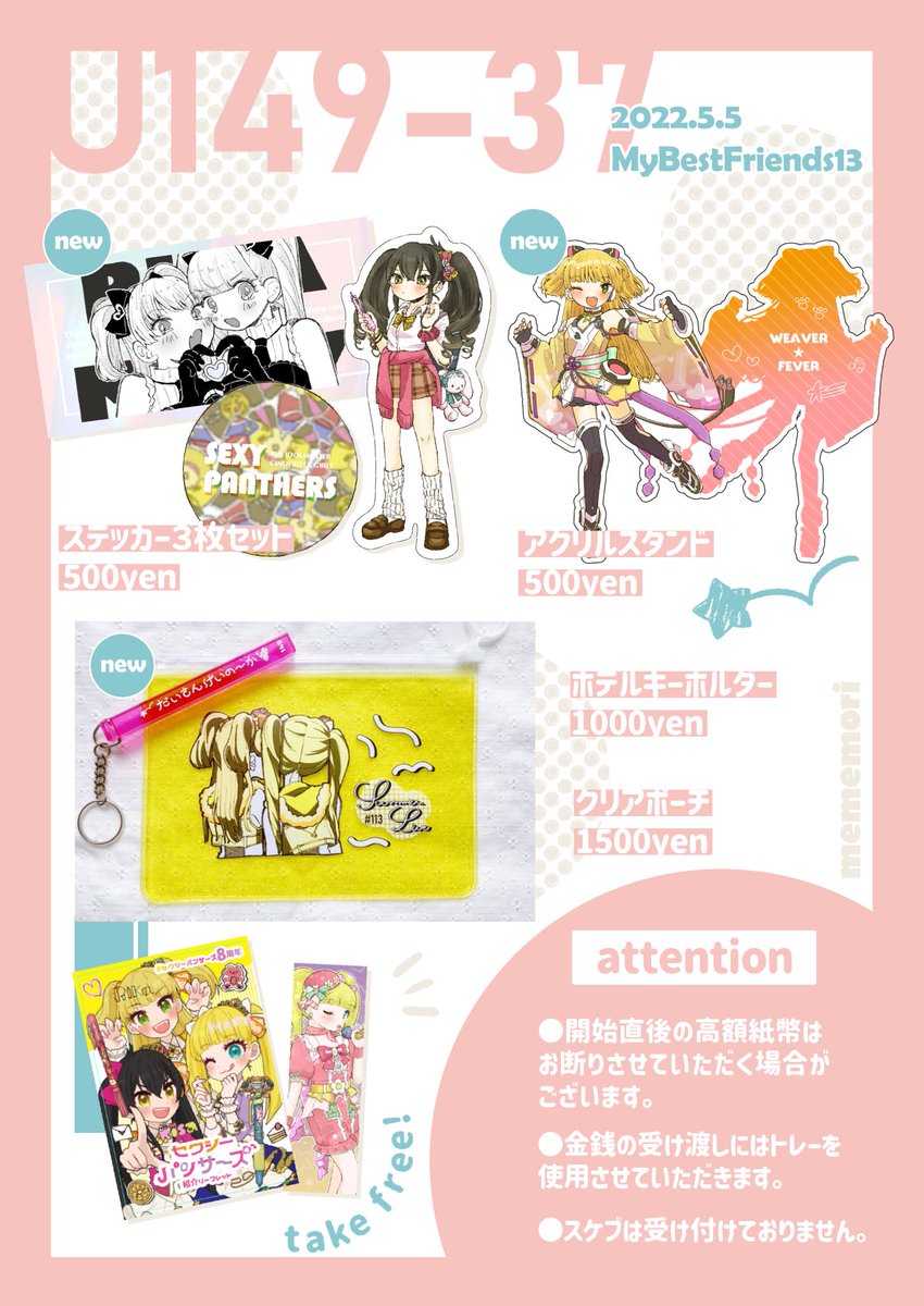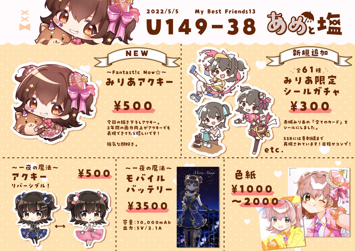 5/4MBFのお品書きです📝 新刊は第3芸能課年齢操作イラスト本第二弾🌻 去年のU149オンリーで頒布した年齢操作イラスト本第一弾も少しだけ再刷したので持っていきます✨ 追加で色紙いっぱい持っていけたらな~&無配ペーパー描けたらな~の気持ち、、💭 #MBF14 #U149オンリー twitter.com/suzushi1122/st…