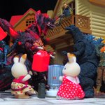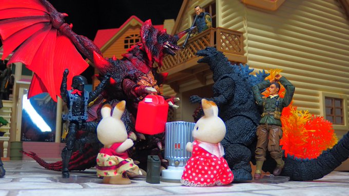 #夜のフィギュア撮影会 お題「フリー」過去 寒くなってきたからアラジン(石油ストーブ)で 温まりましょう #シルバニアファミリー #ゴジラ #3・75インチアクションフィギュア #マローダー #MARAUDER #UNIMAX #リーメント
