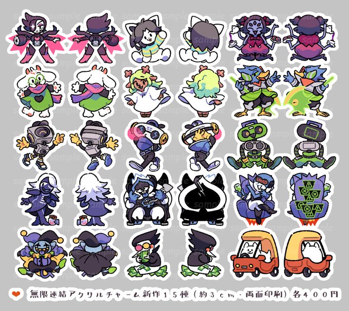 2/20 UNLIMITED EX9東京 【無限連結アクリルチャーム新作15種 各400円】 約3cm(アクリル4cm)/両面印刷/金カニカン 裏面傷防止クリアコート加工 昨年頒布したチャームと同仕様の新作(UT3種+dr12種)です。 新作15種と合わせて完売していた20種も再販します。 #UTdr同人 #UNLIMITED_EX9 #アンリミ9 twitter.com/podmachi_ut/st…