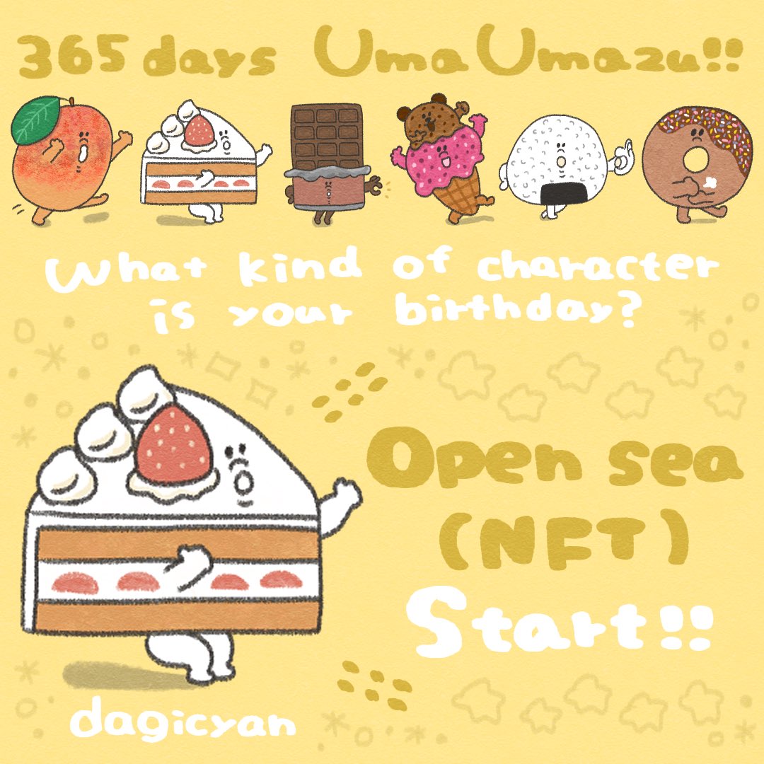 Open sea (NFT) / dagicyan opensea.io/dagicyan スタートしました\( ¨̮ )/ 【365 days Uma Umazu‼︎】 What kind of character is your birthday? あなたの誕生日は どんなキャラクターかな¨̮⁇ 毎日クスッとはっぴーに¨̮♡ instabio.cc/dagicyan #Opensea #NFT #NFTartists #UmaUmazu‼︎
