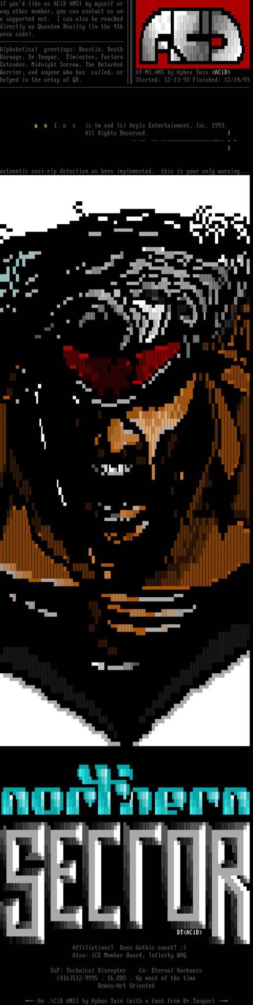 “The Northern Sector” #Union #ANSI by Aphex Twin, logo by Dr. Tongue / ACiD (1994) #ansiart #ascii #asciiart #pixelart #textmode #text #art #demoscene #bbs #retrocomputing #retrographics #typography #graffiti #graffitiart #imagecomics #image30thanniversary #comics #comicbookart