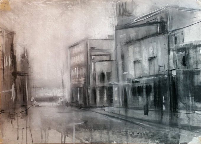 Can a street have a ghost? Mixed media on paper #art #painting #landscape #landscapepainting #urban #urbanlandscape