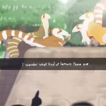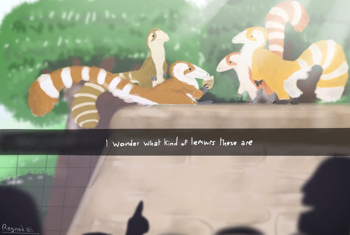 a pack of #sinosauropteryx in a park (or zoo), one of them is feeding on bread, anyone know what species of lemurs they are? #UrbanPrehistory #paleoart #dinosaur