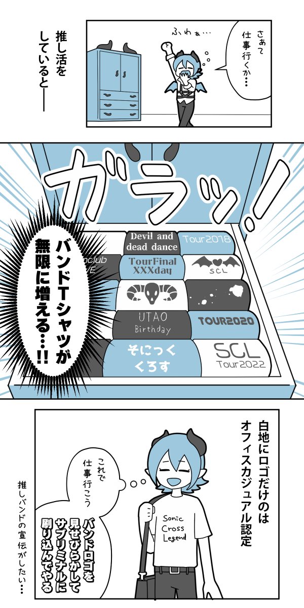 『バンギャになって20年』第5話 バンドTシャツのお話を描きました。増え続けるTシャツ、タンスのこやしにしたくない…!! #漫画が読めるハッシュタグ #コミックエッセイ #バンギャ #推し活 #V系 #バンギャになって20年