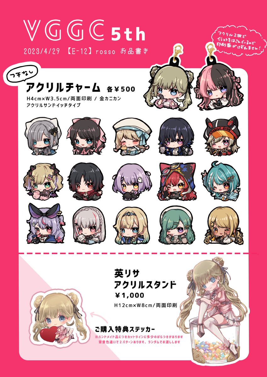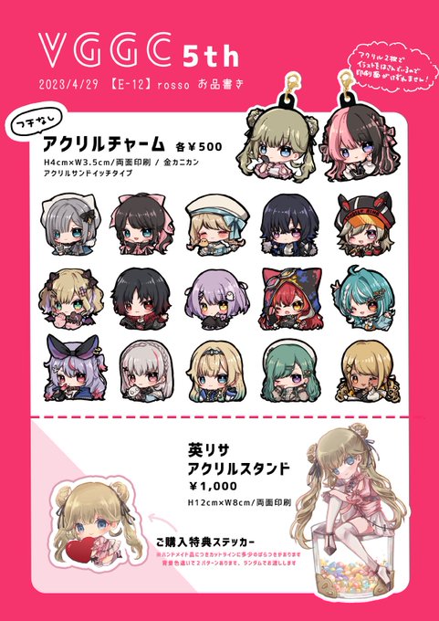 遅くなりましたがVGGC5thのお品書きです! 種類多いので少しずつ持っていきます。両面アクリルサンド可愛くできたのでぜひ見に来てください…! 【E-12】rossoでお待ちしています!当日はよろしくお願いします~ #VGGC5th ▼お取り置き受付してます(フォロワーさんのみ) triokini.com/circle/item/li…